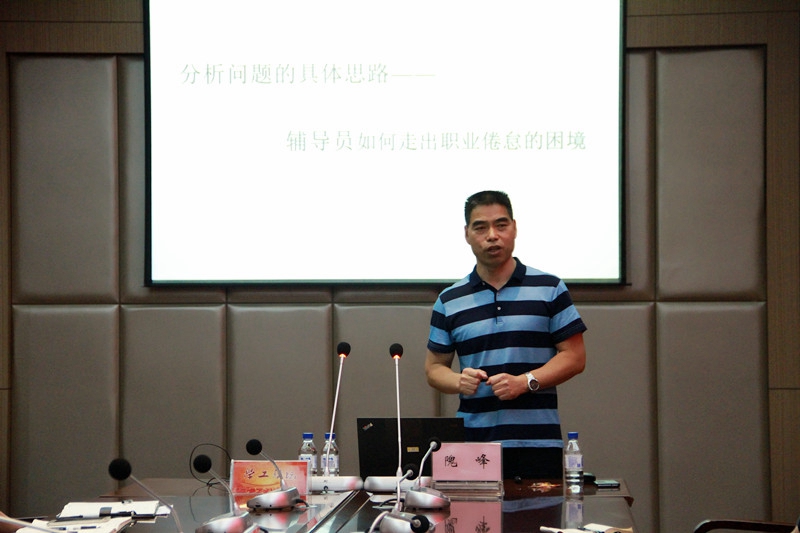 论坛上,隗教授围绕着辅导员如何走出职业倦怠,首先向老师们介绍了心理咨询的基本理论,通过生动形象的事例为老师们展示了心理学知识在学生管理工作中的应用。结合具体的学生管理工作,分析辅导员职业倦怠产生的原因、具体表现及其特点,从而探索出辅导员如何走出职业倦怠的具体路径。他指出只有建立好的工作机制,通过高效创新的方法,在学生管理工作中不断寻找意义感和价值感,才能有好的工作思路,才能找到问题解决的出路,从而才能有所作为。报告中,隗峰教授运用丰富的教育学和心理学知识,分析了各阶段学生的具体特点和内在需求,从“事件、模式、结构、心态、愿景”五个思考和解决问题的不同层次,引导大家建构顶层设计,掌握正确的和学生沟通的技巧,引导学生自我卷入,找到问题解决的方法,提高管理学生和思想引领的针对性和实效性。