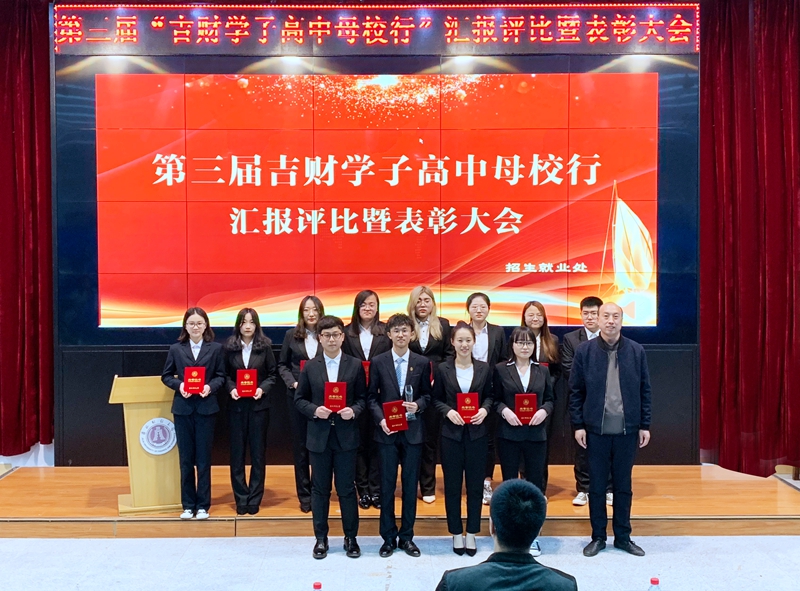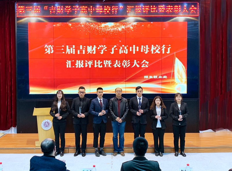 本网讯(招生就业处 供稿)4月10日下午,由招生就业处主办的“第三届吉财学子高中母校行”汇报评比暨表彰大会在1201报告厅举行。参加本次大会的有招生就业处竭岸扬老师、赵宝华老师、学生工作处黄建东老师、赵彦双老师、各学院辅导员,以及本届母校行全体志愿者。大会由张馨元老师主持,来自法学院、税务学院、公共管理学院、会计学院、国际经济贸易学院的五名志愿者代表登台做活动汇报展示,评委老师根据实践报告、汇报内容、创新形式、团队协作等方面的表现评选出本届母校行先进团队、先进个人,并给予表彰。