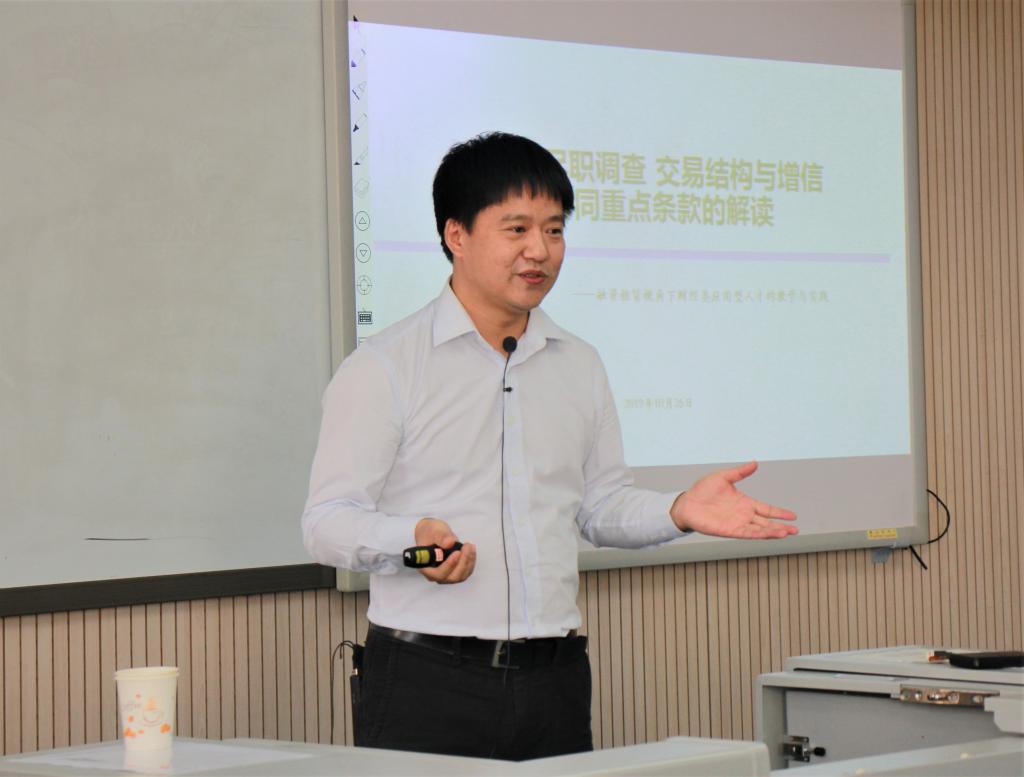 开班仪式后,华北电力大学经济管理学院赵洱岽教授——教育部第二届全国高校微课教学比赛一等奖、经济管理学科第一名获得者,做了题为《基于教育信息化的混合式学习模式的构建与应用——以国家精品课程“管理沟通”为例》的报告,赵教授以自己主持的国家精品在线开放课程《管理沟通》为例,详细讲解了在线课程的系统性教学设计、慕课建设和应用经验,特别是慕课制作关注的重点和慕课录制的注意事项,提出了混合式金课建设与发展建议。26日下午,北京国资融资租赁股份有限公司的董旭操博士做了题为《项目尽职调查、交易结构与增信、合同重点条款的解读》的报告,结合丰富的案例详解讲解了融资租赁业务的整个流程、项目尽职调查的具体细节,并对合同的重点条款进行了解读,让我们对融资租赁这种新型金融业态有了全面的了解。