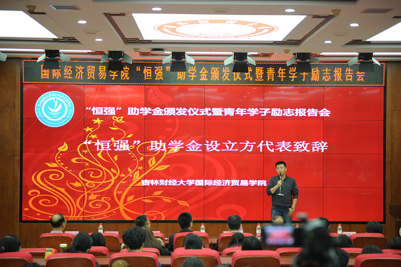 本网讯(记者 李梓涵 摄影 李梓涵 郭娜娜) 11月12日晚六点半,国际经济贸易学院首届 “恒强”助学金颁发仪式暨青年学子励志报告会在1202报告厅隆重举行。kaiyun官网国贸9620班两位校友、“恒强”助学金出资设立方、杭州亿涞光电科技有限公司董事长邵志强、北京贤智汇咨询有限公司董事长宋晓恒,原国经系辅导员、现北方人力资源投资集团董事长巩汉春,学生工作处副处长赵彦双,国际经济贸易学院党总支副书记赵钺,国经学院教师代表以及本次受助的六名品学兼优的家庭经济困难学生和全体大一同学参加了活动。活动由国际经济贸易学院副院长关嘉麟主持。