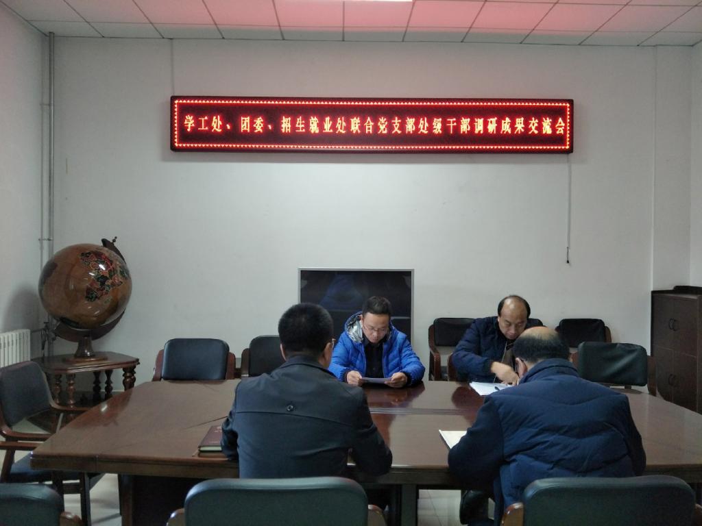本网讯 近日,学工处、团委、招生就业处联合党支部在大学生活动中心一楼会议室召开处级干部学习调研成果交流会。支部书记赵彦双主持会议。
