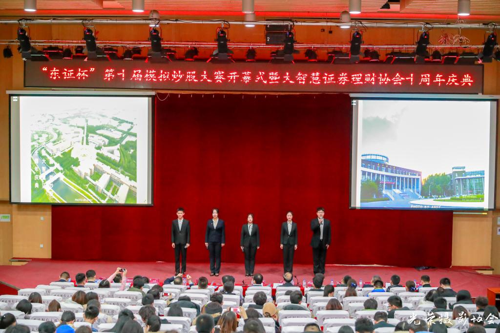 本网讯(国际交流学院 供稿)11月29日,国际交流学院在图书馆报告厅举办了“东证杯”第十届模拟炒股大赛开幕式暨“大智慧证券理财协会”十周年庆典主题活动,国际交流学院院长张振华教授、党委书记马晓旭副教授、副院长李根生老师、党委副书记刘宇龙老师、团委书记杜金亮老师、团委郝兴财老师及学院19级同学参加了本次活动。同时,吉林证监局法制处魏鹏副处长、吉林省证券业协会秘书长贾艳波女士、东北证券财富与机构条线总经理李一隽女士、东北证券长春人民大街营业部总经理任增辉先生以及东北证券长春人民大街营业部的团队骨干和部分成员受邀出席了本次活动。