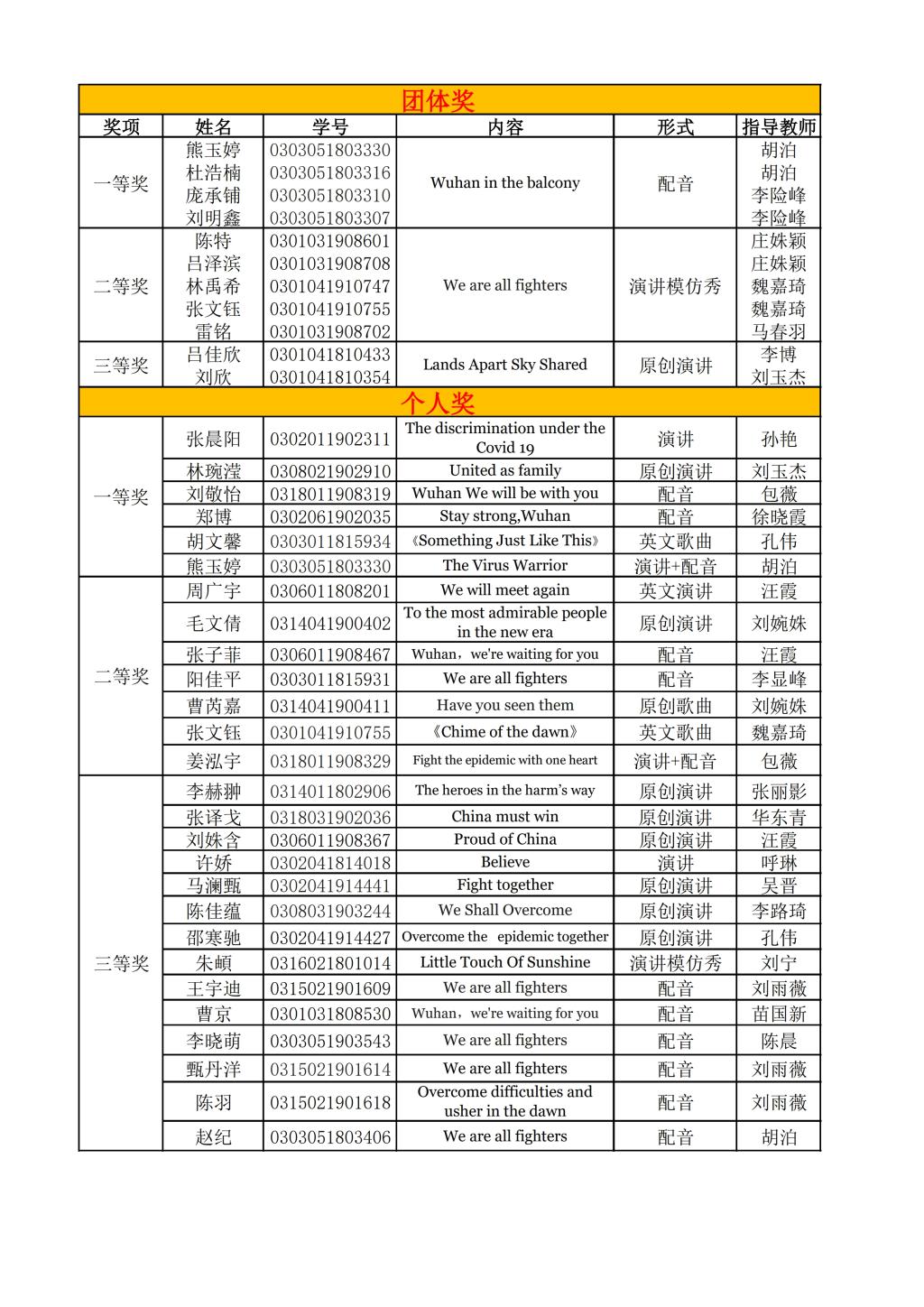 疫情之下的新学期“停课不停学”,师生通过网课隔空相见。2020年4月到5月间,课程组适时而动,举办了线上的“英语微视频”大赛。活动得到了同学们的积极响应,课程组收到了大量作品。同学们在居家环境中用手机或电脑录制短视频,用自己的声音为武汉加油,为中国加油!还有的同学隔空携手,以团队或班集体的方式参赛。作品以英文演讲、英语配音、英文歌曲等丰富多样的表现形式讴歌了工作在一线的抗疫人员,弘扬主旋律、传递正能量。最后,张晨阳、林婉滢等6位同学的作品得到评审老师们的一致好评,获得个人一等奖;另有7个优秀作品获评个人二等奖;13个作品获评个人三等奖;3个团体作品分获一、二、三等奖。