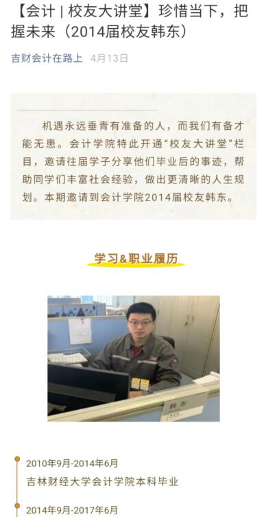 此项活动得到了校友的大力支持,78级校友崔少华和88级校友何俊岩分别为活动撰写了寄语。历届优秀校友纷纷撰文向同学们分享就业经历;安徽大学博导05届校友周泽将教授《使劲的努力,平静的接受》;吉林省中行金融部主任10届校友曲东魁《繁花盛,再一程》;中车长春轨道客车股份财务部14届校友韩东《珍惜当下,把握未来》;吉林大学财务处15届校友孙村惠子《在选择中提升格局,在感恩中砥砺奋斗》;华为公司原长春市十佳大学生16届校友李金鹏《春风得意马蹄疾,我辈岂是蓬蒿人》;北京悦读文化传播有限公司创始人16届毕业生柴思宇《我的创业二三事》;华为技术有限公司19届优秀校友李才寓《竹杖芒鞋轻胜马,谁怕?一蓑烟雨任平生》;中国石油天然气集团审计服务中心的16届校友解宏升《求职心得经验分享》;中化集团中国金茂控股集团有限公司17届校友于涵《成长分享与职业规划建议》共10名优秀校友为毕业生就业进行了云指导。