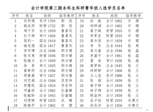 在随后第三期本科生科研菁华班的选拔中,会计学院大二大三年级各专业本科生积极踊跃地报名参与,学生们根据自身感兴趣的研究领域选择指导教师,共有82位本科生报名参与了本次科研菁华班选拔。由指导教师对学生进行面试,在综合考量包括学生的成绩排名、科研意愿与学术潜能的基础上,最终确定36位同学入选科研菁华班。(审核人 梁毕明)
