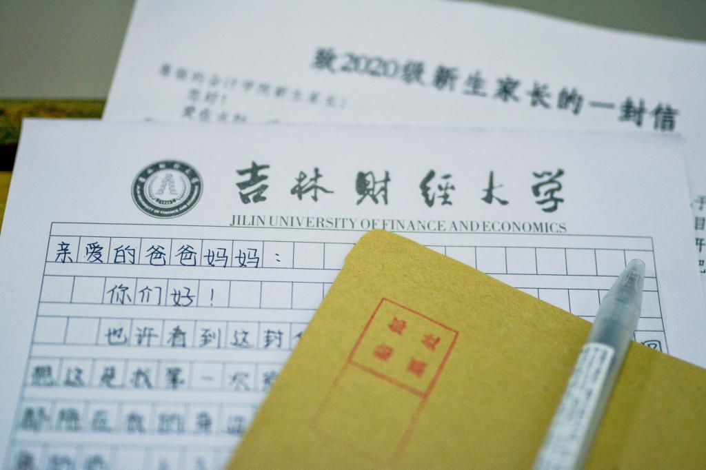 受疫情影响,2020级新生家长没有走进美丽的吉财校园,会计学院的老师和家长们也没能像往年一样面对面交流孩子的培养目标和培养方式。为加强家校联动,会计学院开展了“一封家书”家校联动主题教育活动。活动初期,我们为每一位2020级新生同学拍照并打印出来作为入学纪念。同学们以《与吉财初遇的日子》为主题手写一封家书,表达对亲人的思念及近一个月在学校的收获和感悟。有些平时想说却又不好意思当面说出口的话,同学们可以在信中尽情抒发自己的情感,增进与父母的感情,拉近与家人的距离。