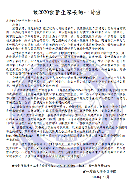 同时,会计学院也向家长们致信一封,介绍了学院近期新生的入学教育情况和活动开展情况,请家长们放心,学院一定会照顾好每一位同学,让他们既能收获知识,又能感受到家的温暖,也请家长们要多多关注学生的身心健康和学业状况,与孩子和老师保持密切联系。学院全体教师对家长们致以深深的祝福和亲切的问候!