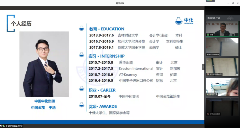 11月8日晚19:00,会计学院在线上举办了主题为“成长分享与职业规划”的第一期活动。会计学院院长梁毕明教授、学院团委书记王萌老师以及学院200余名同学参加了本次活动,活动邀请到注会2017届校友于涵作为主讲人。