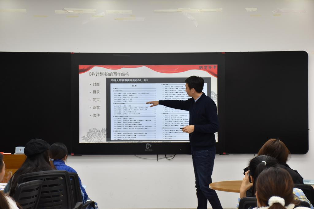 骆老师用自身的经验结合在场同学的创意提出了“我是谁?”“我为什么这么做?”“我是怎么做的?”“我现在做的怎么样?”“我未来要做什么?”这五个问题。并由此展开将项目名称、行业分析、项目简介、创业价值主张、产品描述、营销战略、团队架构、财务数据分析等这些创业计划书中的要素展现得淋漓尽致,使同学们对BP计划书的写作结构及要素有了充分的了解。
