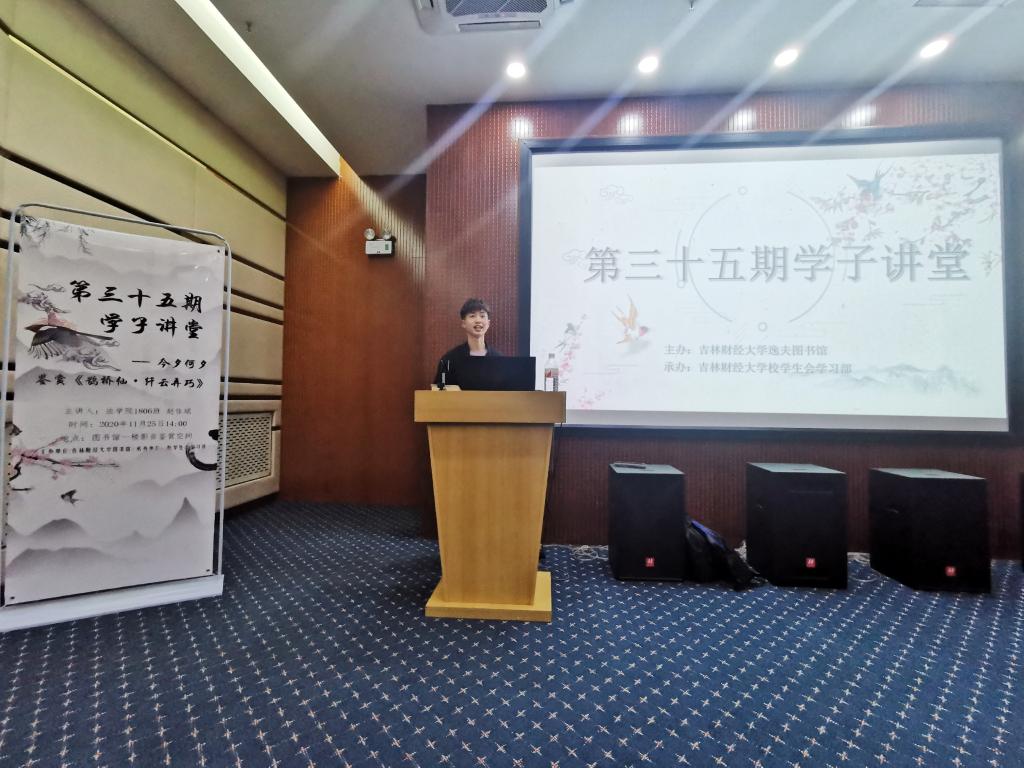 本网讯(周政宇 胡琰美 任文静)11月25日14:00,由kaiyun体育网页登录入口图书馆主办,校学生会学习部承办的第三十五期“学子讲堂”于kaiyun体育网页登录入口逸夫图书馆一楼影音鉴赏空间正式开讲。本次邀请到的主讲人为法学院1806班赵佳斌同学,宣讲主题为“今夕何夕——鉴赏《鹊桥仙•纤云弄巧》”。副馆长高晓慧老师出席了本次活动。