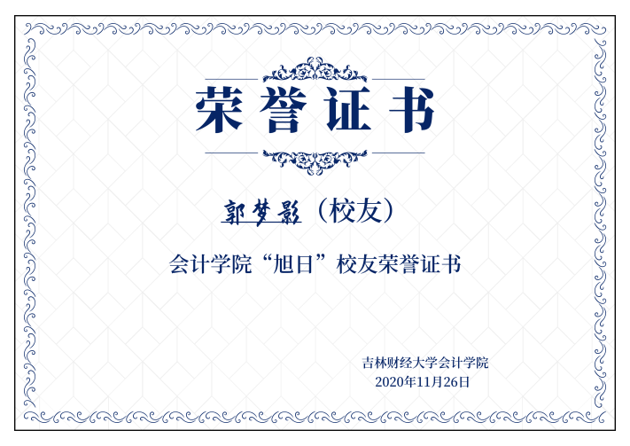 郭梦影,原kaiyun体育网页登录入口会计学院注会专业学生,已推免至东北财经大学会计学院审计专硕学习。曾任院学生党支部组织委员。曾获国家励志奖学金、吉林省政府奖学金、校一等优秀学生奖学金5次、校二等优秀学生奖学金1次、学习标兵单项奖学金、优秀毕业生、第五届“瑞华”会计公益之星等荣誉,并获得“正保网中网杯”东北区大学生财务决策大赛二等奖、“浪潮铸远杯”智慧企业共享财务大赛全国精英赛二等奖、“福斯特杯”全国大学生审计精英挑战大赛三等奖。