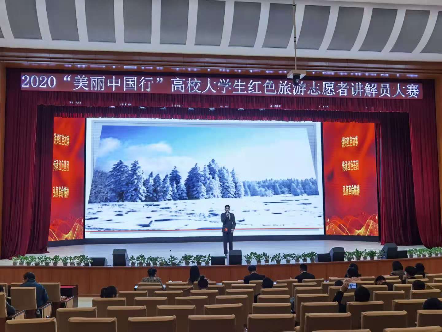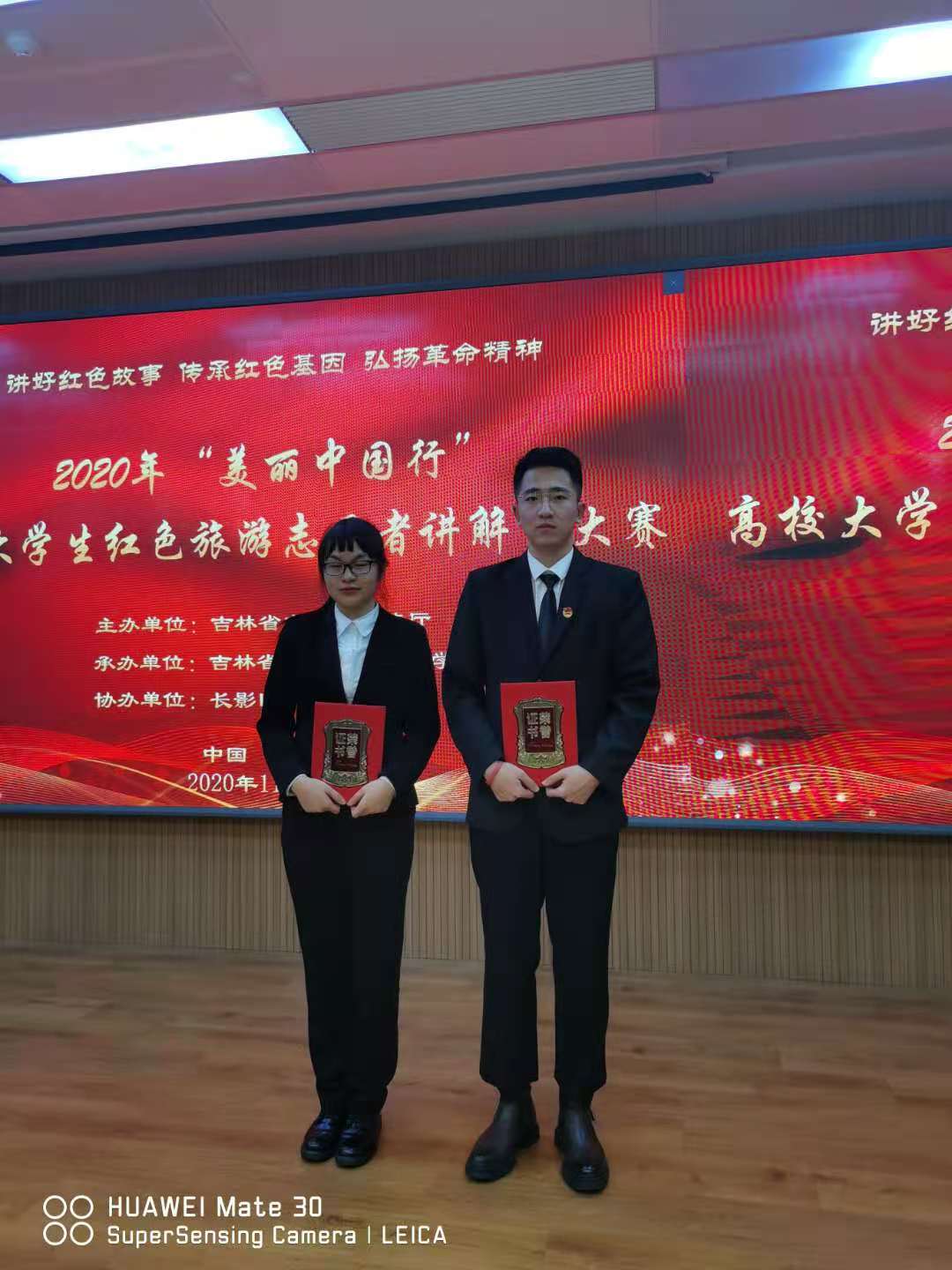 本网讯(亚泰工商管理学院 供稿)11月19日,由吉林省文化和旅游厅主办的2020年“美丽中国行”吉林省高校红色旅游志愿者讲解员大赛决赛在长春举行。经过激烈角逐,kaiyun官网亚泰工商管理学院旅游管理1813班陶江林同学和旅游管理1914班王姿奥同学在旅游系焦连成老师指导下,分别获得二等奖和三等奖的好成绩。