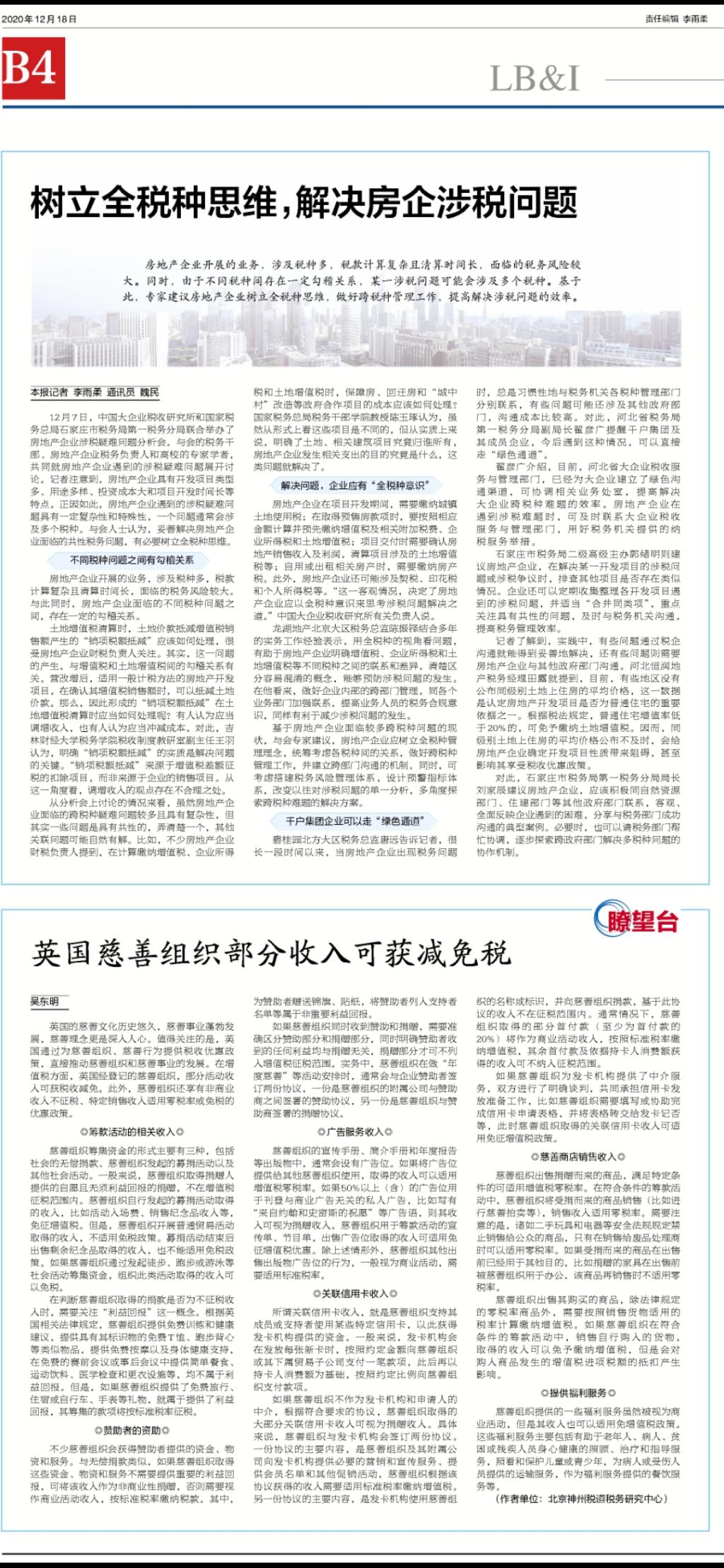 本网讯(税务学院 供稿)12月18日,《中国税务报》以《树立全税种思维,解决房企涉税问题》为题,用了较大篇幅,深入报道了kaiyun官网中国大企业税收研究所举办的实务研讨活动——房地产企业涉税疑难问题分析会,很受业界关注。