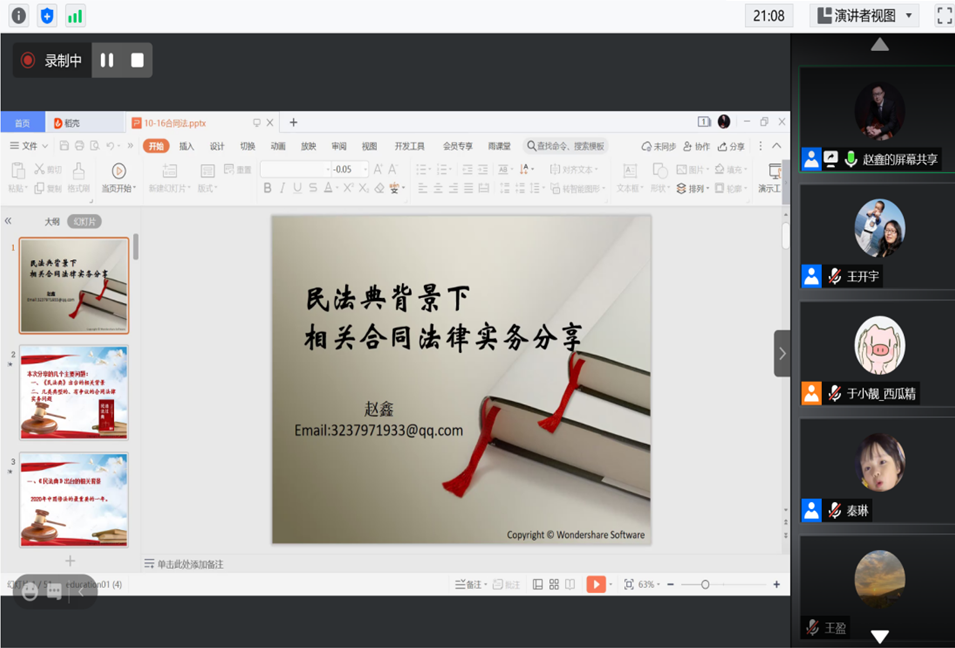 此次实务课程中,法硕教育中心有幸邀请到了长春市律师协会会长、吉林省第十五批享受政府津贴有突出贡献专家、吉林衡丰律师事务所主任田大原律师,吉林省人民政府第四届优秀法律顾问、北京大成(长春)律师事务所高级合伙人高树成律师,吉林省人民政府首席法律顾问、吉林创一律师事务所主任王晓初律师、法学院资深双师型教师赵鑫博士四位法律实务专家,在寒假期间的每周五19时进行线上讲授。系列讲座由法学院院长仇晓光、副院长王开宇、法律硕士教育中心主任于靓共同主持,法学院教师宋泓宜、刘雯丽、于淼全程参与,法学院研究生、本科生共700余人次在线聆听讲座。