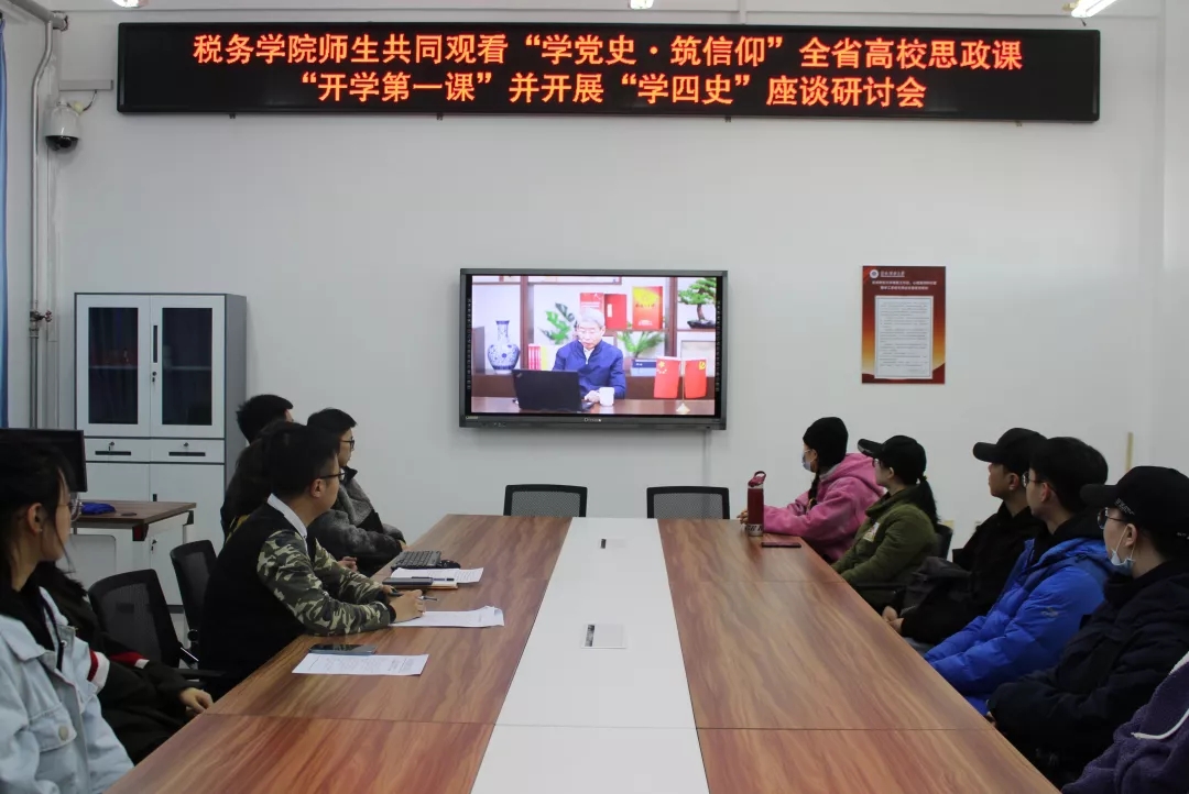 税务学院全体学生观看了“学党史•筑信仰”全省高校思政课“开学第一课”,并于3月16日下午在一教1441教室由团委老师和部分学生代表开展了“学四史”座谈研讨会。