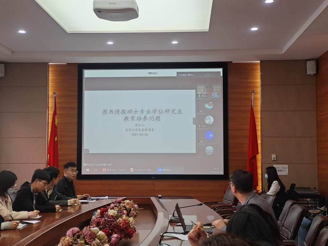 本网讯(管理科学与信息工程学院 供稿)管理科学与信息工程学院、吉林省互联网金融重点实验室、吉林省商务大数据研究中心邀请北京大学周庆山教授于2021年3月24日,在综合楼207会议室作题为“图书情报硕士专业学位研究生教育培养与论文写作问题”的学术报告会。报告会是管信大讲堂新学期第一次活动,采用线上线下方式进行,副院长姜建华教授主持,参会教师、学生62人。