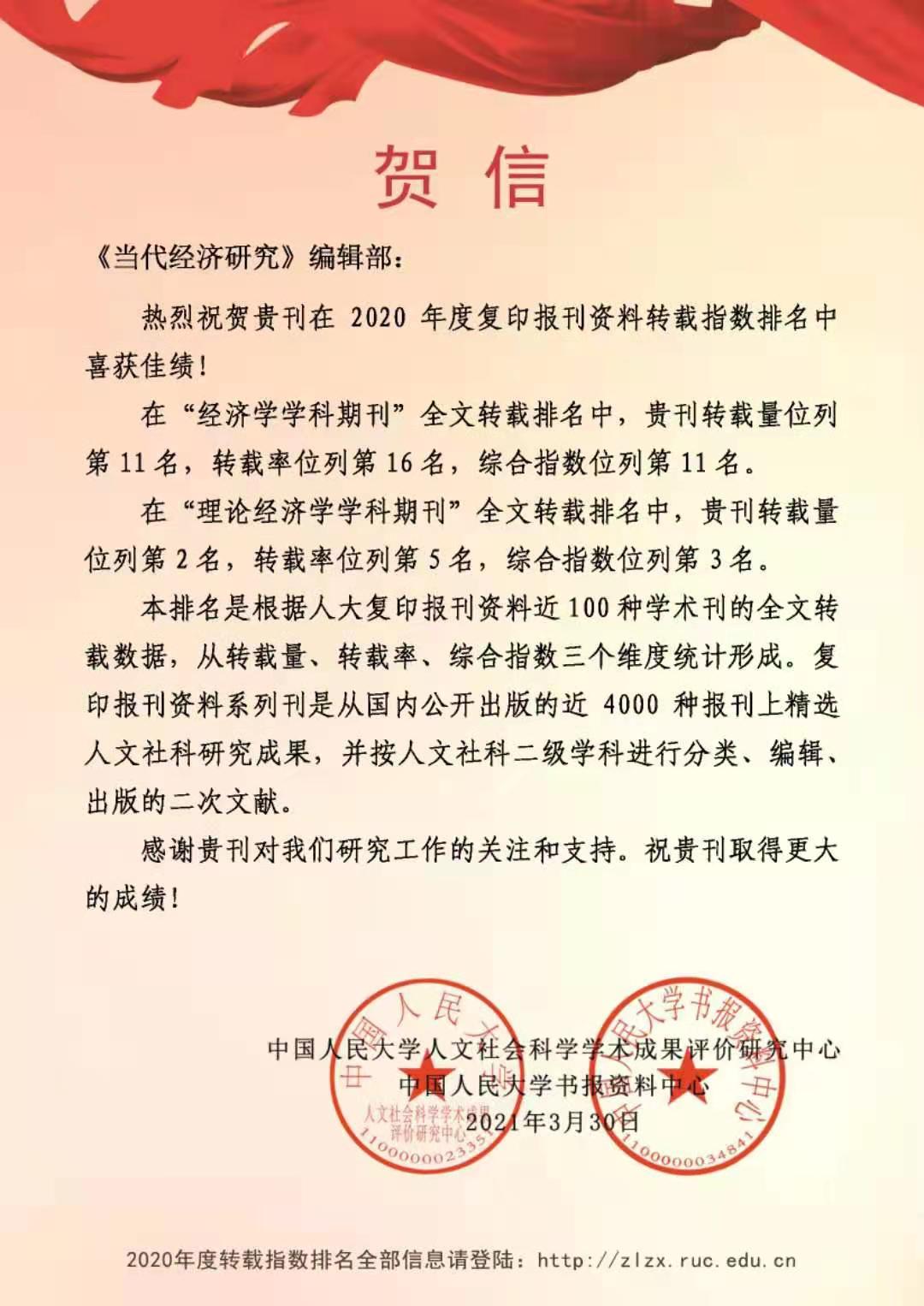 本网讯(《当代经济研究》 刘威)2021年3月30日,中国人民大学人文社会科学学术成果评价中心发布了“复印报刊资料(2020)转载指数排名”。在分学科期刊排名中,《当代经济研究》“二次文献”转载再创佳绩:在理论经济学期刊转载指数排名中,《当代经济研究》转载量排名第2位,转载率排名第5位,转载综合指数排名第3位。据悉,“复印报刊资料(2020)转载指数排名”中,理论经济学学科涉及全文被转载的期刊数量为229种,转载全文总量为913篇,约占复印报刊资料学术刊全文转载总量(11019篇)的8.3%,其中,转载量排在前30名的期刊共被转载476篇,约占复印报刊资料学术刊全文转载总量的4.3%。(审核人 魏旭)