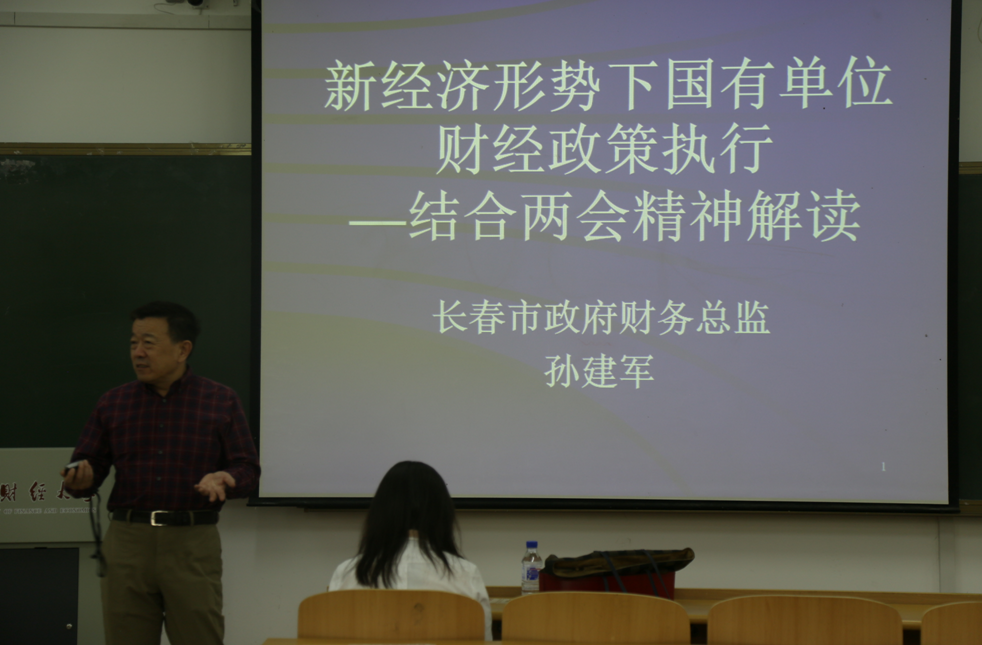 本网讯(会计学院 梁斯琦)5月26日星期三下午一点,长春市政府委派财务总监中心财务总监、正高级会计师、注册会计师资格,吉林省管理会计专家咨询委员会成员、绩效组组长,吉林省会计学会专家组成员,吉林大学、东北师范大学外聘教师,东北师范大学、kaiyun体育网页登录入口会计学硕士校外导师,吉林省会计领军人才孙建军老师,莅临kaiyun官网第一教学楼1106教室开展“新经济形势下国有单位财经政策执行—结合两会精神解读”主题讲座。