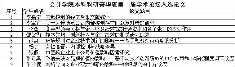 会计学院本科科研菁华班已经选拔成立第三届,其成立宗旨就是为了培育本科生科研兴趣爱好,尤其是针对可能的推免生,助力科研成果发表,提升竞争力;之前两届的本科科研菁华班学员已累计发表近20篇,且学员中有被推免到包括吉林大学、中国海洋大学等高等学府。(审核人 梁毕明)