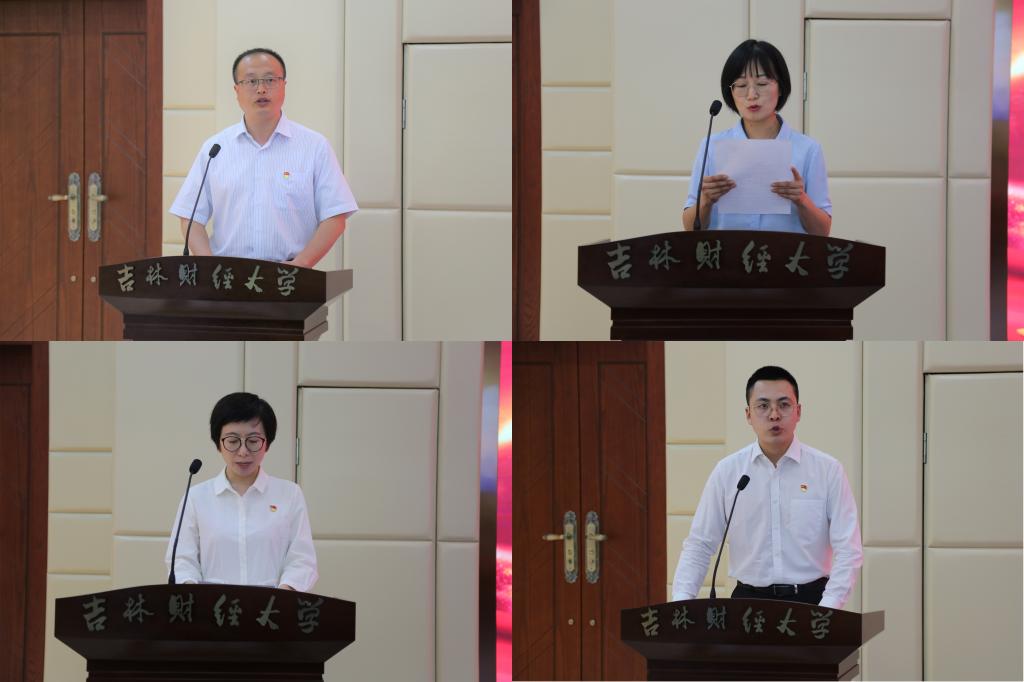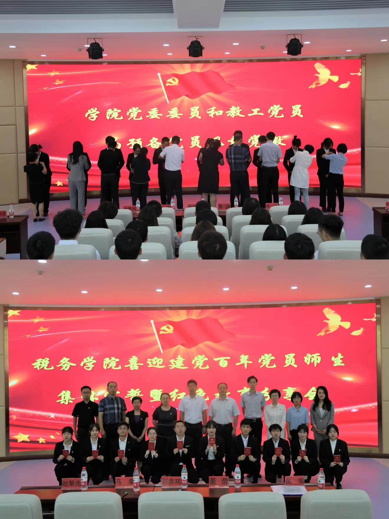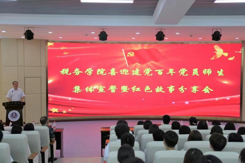 本网讯(税务学院 供稿)为喜迎建党百年,扎实推进党史学习教育,进一步增强党员入党的仪式感和归属感,用红色精神教育和激励党员师生坚定信念跟党走,立足岗位做贡献。6月24日,税务学院党委在教学楼1102报告厅隆重举行“喜迎建党百年党员师生集体宣誓暨红色故事分享会”。学院党委书记赵彦双,党委委员、副院长马莹,党委委员、副院长董蕾,党委副书记赵黎光,党委专职组织员侯旭,党委委员王再堂,党委委员、教工财政党支部书记孔薇,党委委员、教工税务党支部书记苏扬,学院团委老师李广野、范阳、宋忱蔚,研究生党支部的16名党员代表以及2021年上半年新发展的72名预备党员同志参加活动。活动由党委副书记赵黎光主持。