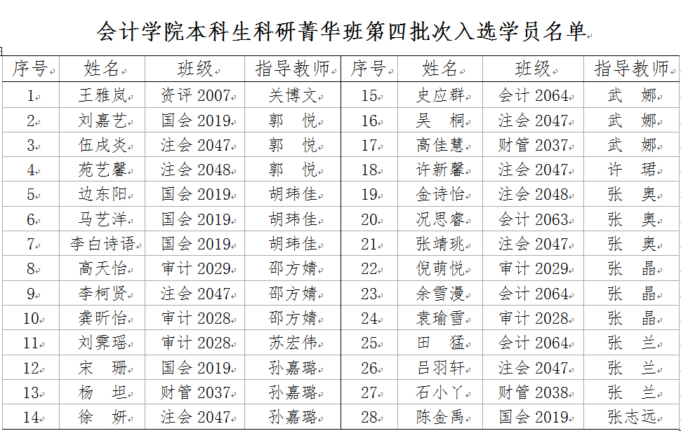 为继续发扬本科生科研菁华班在培养学生科研能力、创新思维等方面的积极作用,会计学院于2021年9月22日在逸夫教学楼2217教室举行了本科生科研菁华班第四期学员选拔。本科生科研菁华班的科研导师目前共有12位具有博士学位的指导教师,并配备专门班主任由邵方婧老师担任。本次选拔依然采用学生自主报名,学生和导师双向选择的方式进行。会计学院大二年级各专业本科生积极踊跃地报名参与科研菁华班的选拔,学生们根据自身感兴趣的研究领域选择指导教师,共有82位本科生报名参与了本次科研菁华班选拔。由指导教师对学生进行面试,在综合考量包括学生的成绩排名、科研意愿与学术潜能的基础上,最终确定28位同学入选科研菁华班。