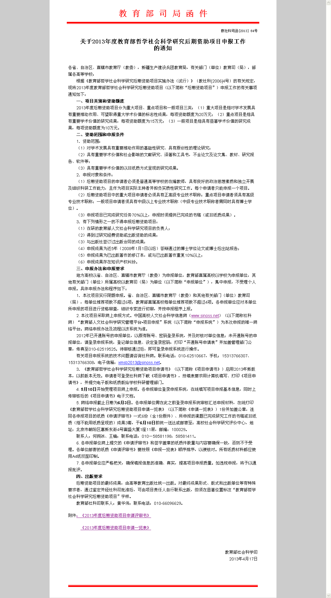 根据《教育部哲学社会科学研究后期资助项目实施办法(试行)》(教社科[2006] 4号)的有关规定,现将《关于2013年度教育部哲学社会科学研究后期资助项目申报工作的通知》(教社科司函[2013]64号)转发给你们,同时组织kaiyun官网开展2013年度教育部哲学社会科学研究后期资助项目申报工作,具体要求如下: