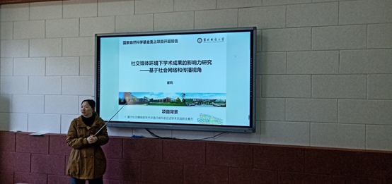 首先,翟莉老师就其国家自科基金面上项目《社交媒体环境下学术成果的影响力研究——基于社会网络和传播视角》、李晓新老师就其国家社科青年项目《我国系统性金融风险统计测度与智能预警研究》进行了开题汇报,并在会上针对数据的筛选、方法应用等方面回答了委员会成员的提问,同时开题答辩委员会成员与其他参会教师为项目研究提出了富有建设性的意见与建议。随后省社科、教育厅与校级项目负责人就项目研究背景意义、研究框架、研究内容、研究方法、成果产出等方面进行了逐一汇报,并对项目开展的一些关键问题进行了答辩。最后,答辩委员会根据答辩总体情况,了解到各项目组的项目前期开展情况均比较好,集体同意各项目组通过开题答辩。