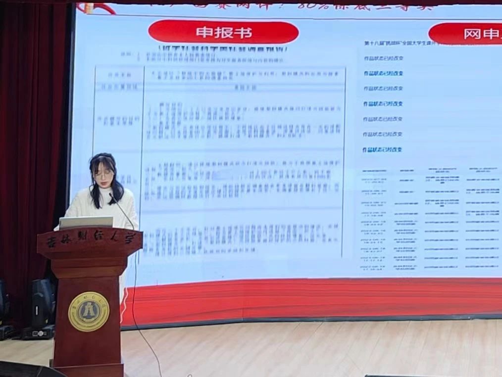 最后,宋振翮同学结合自己的具体参赛经历向与同学分享心得。他们的项目虽然是哲学社科类,但也尽可能准备了一些实物,比如他们组的特等奖,生物降解塑料在餐饮行业中的应用推广的影响因素与作用机制研究——以18个塑料污染治理典型城市为例,带了一些塑料制品上台。在实际操作过程中,需提前筹谋规划,明确团队分工,始终坚守项目初心,用坚持踏实的精神、一丝不苟的态度和精益求精的韧劲去打磨参赛作品。
