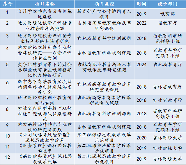 资产评估专业教学团队荣获吉林省高校教师教学创新大赛一等奖、吉林省高等学校优秀教学团队、“三全育人”先进集体、“四有”好老师师德先进团队等。资产评估专业团队成员的本硕博学科背景涉及工商管理、西方经济学、金融学、数量经济学、产业经济学、管理科学与工程等,体现了跨学科交叉融合。团队成员具有注册会计师和资产评估师职业资格、吉林省人才称号,荣获吉林省学术类会计领军人才、“亚泰杯”最受欢迎教师、事业单位优秀工作人员、科研先进个人、本科毕业论文/实习报告/调查报告优秀指导教师、学科竞赛优秀指导教师、教学竞赛一等奖等荣誉称号。主持或参与国家自然科学基金、教育部人文社科基金等多项国家级和省部级教科研项目。
