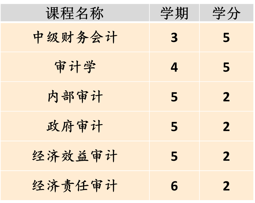 这里着重介绍专业教育的课程情况。专业教育包括专业必修课和专业选修课两个模块,其中,专业必修课共6门,18学分,注重审计核心课程的讲授,提升审计核心职业能力。
