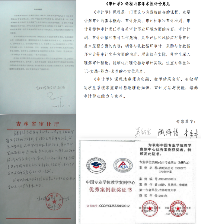 吉林大学吴小丁教授说:“审计学课组程教学队伍结构合理,认真负责,教学内容新,教材水平高,采用现代化教学方法,重视实践教学,教研和教改成绩突出。”