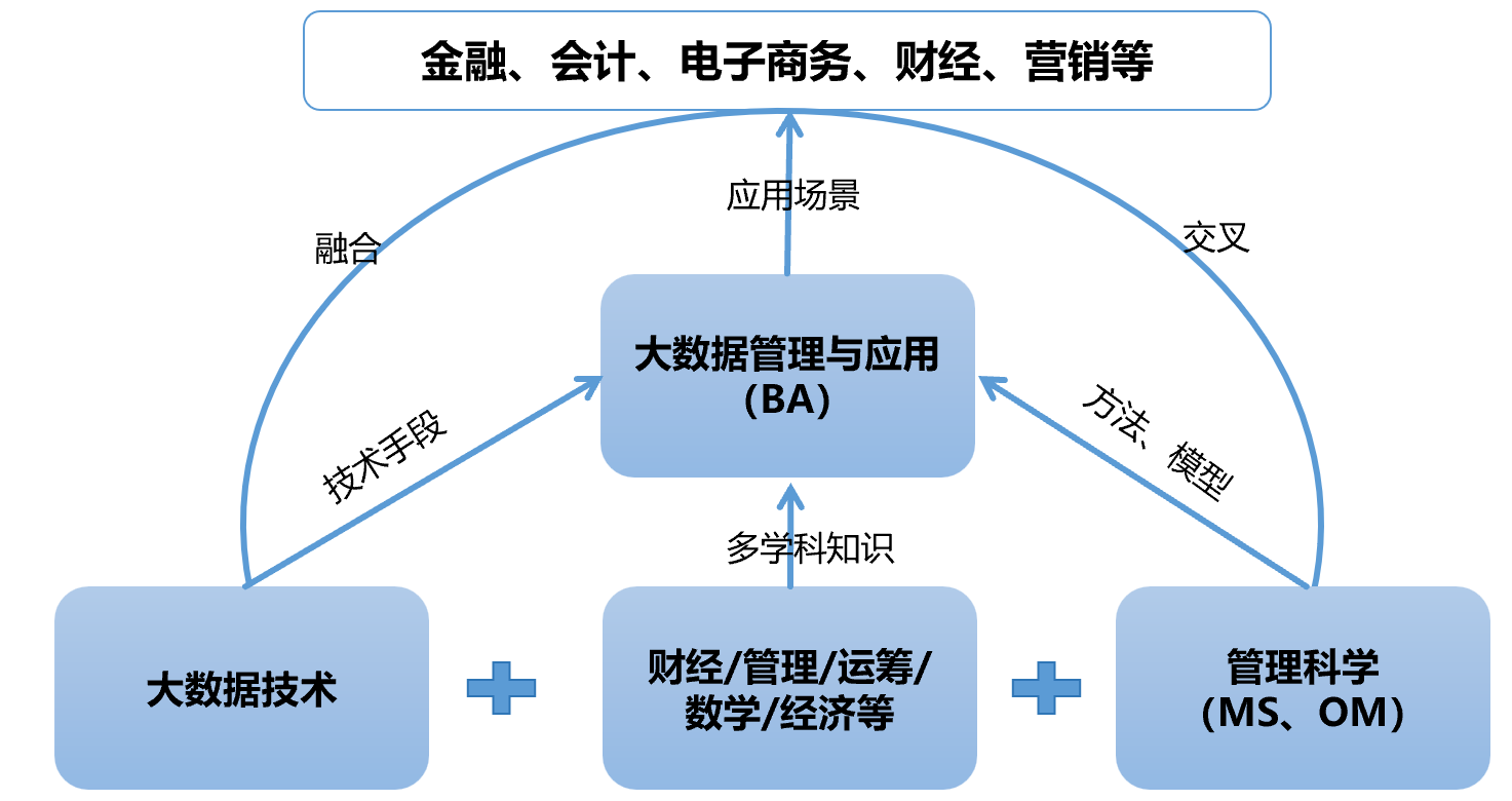 大数据管理与应用专业立足学校建设国家一流财经特色名校的目标,应对新一轮科技革命与产业变革,坚持专业对接产业,培养具备良好科学精神和工程素养,具有良好的数据科学基础,掌握面向互联网大数据环境的数据处理和分析方法、面向行业数据管理方向的管理科学专业知识,具有较强的大数据管理能力和技术应用能力,熟悉行业领域的大数据管理工作,能够掌握和综合运用大数据管理理论、方法、工具,对现代管理业务问题进行数据建模、智能分析和管理决策的高素质、复合型管理人才。