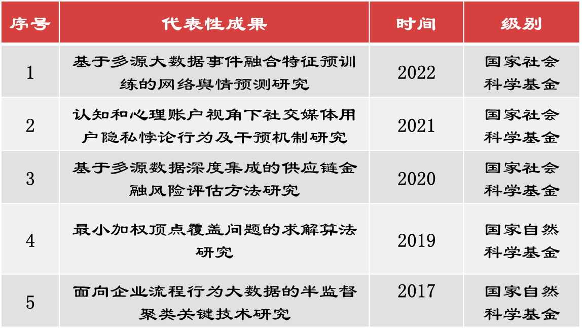 教研相长,教学是传授知识的过程,而科研是探索新知识的过程。两者相辅相成,教学为科研提供基础,科研则为教学提供新的素材和动力。本专业教师近年来围绕数据科学取得了一批的标志性成果,其中包括国家两金项目6项,省厅级科研课题23项,横向课题13项,SCI、SSCI、EI、CSSCI检索论文63篇,出版学术专著7部。