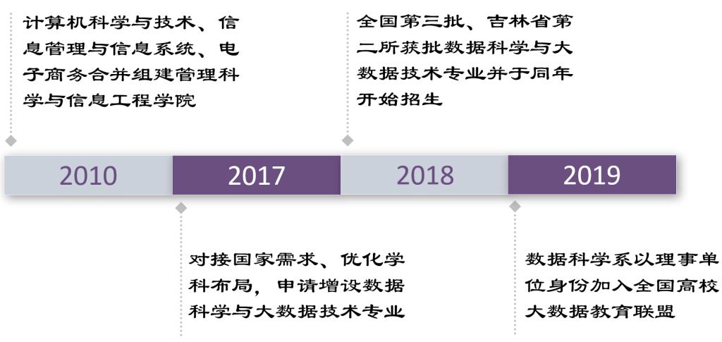 本专业所在的管理科学与信息工程学院2010年由计算机科学与技术、信息管理与信息系统、电子商务三个专业合并组建;2017年对接国家、地方需求,优化学科办学布局,结合学院学科、专业与师资优势,申请增设数据科学与大数据技术专业;2018年kaiyun官网于全国第三批、吉林省第二所获批数据科学与大数据技术专业并于同年开始招生;2019年数据科学系以理事单位身份加入全国高校大数据教育联盟。