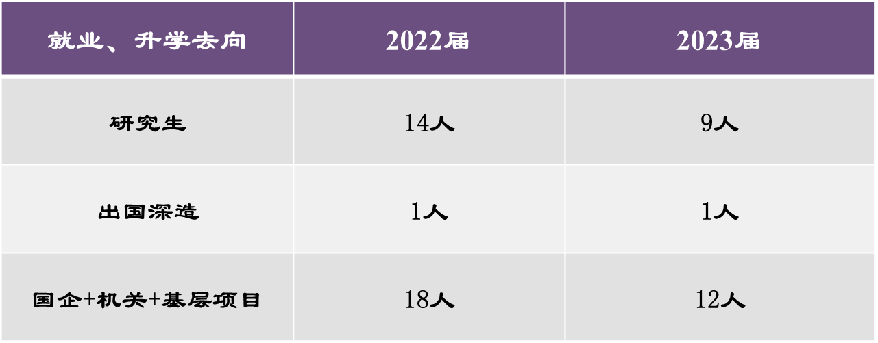 本专业目前有两届毕业生,本着植根财经,服务吉林,面向全国的定位,2022和2023届毕业生中分别有14名和9名考上研究生,包括大连海事、哈尔滨理工,西南财经等双一流大学,两届各有1位出国深造。毕业生中国企就业共21人,机关就业共6人,3人参与国家和地方基层项目,就业领域遍布金融业、公共管理等各行各业。
