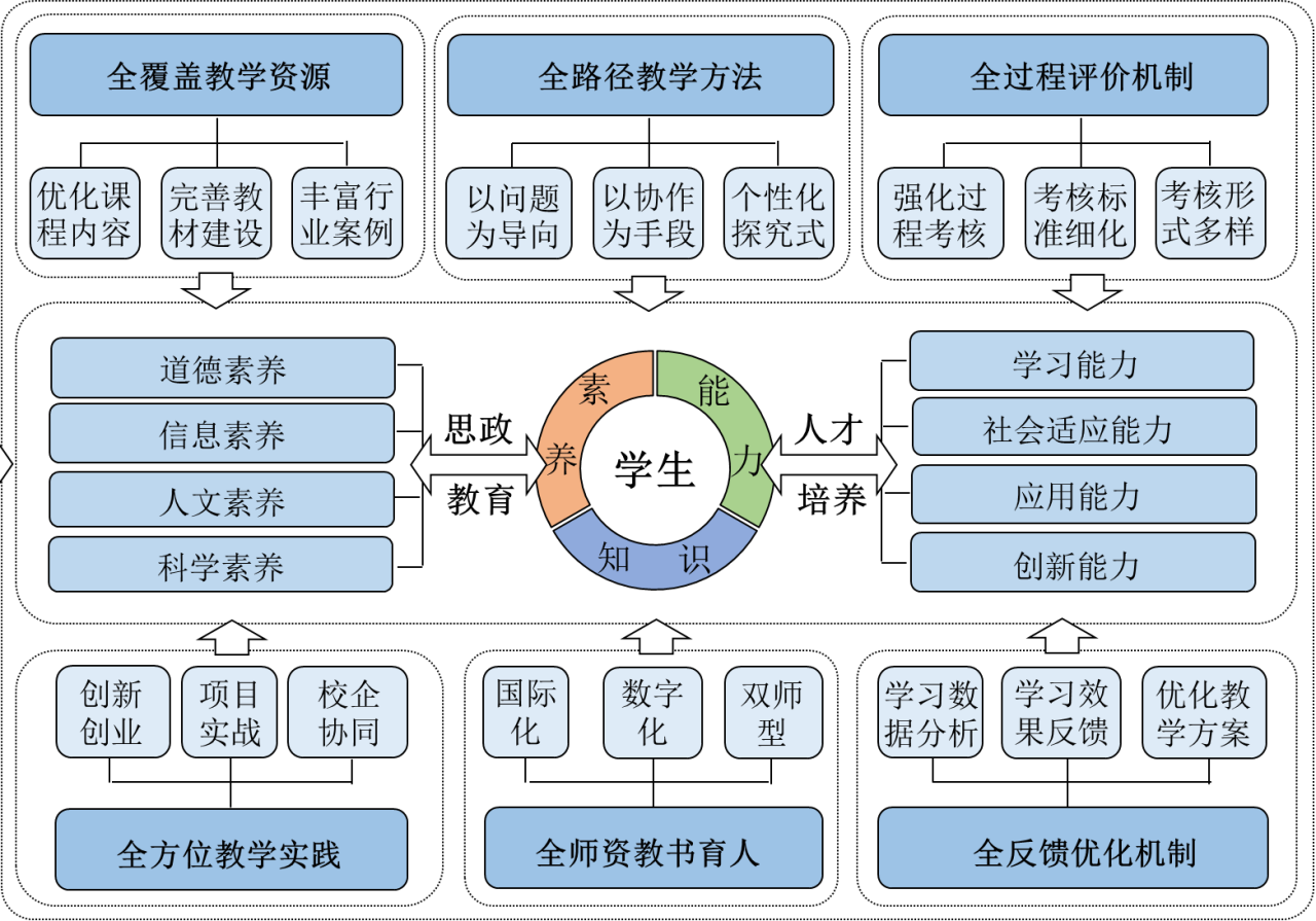 本专业依照教指委指导,持续推进专业综合改革,创新提出全要素、全路径多元化育人,保障新专业人才培养质量。构建以学生与教师为主体,学科“联动”、校企合作“驱动”、国际合作“拉动”、科学研究“推动”的“双主体、四维、四驱动”多元育人模式。