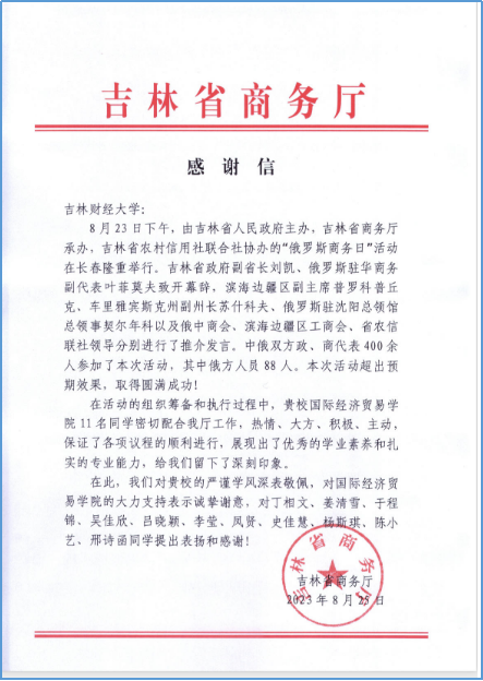 我院还主动对接省商务厅,选派学生参加第十四届中国-东北亚博览会“俄罗斯商务日”活动,活动结束后kaiyun官网收到吉林省商务厅的感谢信,对本专业学生的学术素养和专业能力予以高度肯定。