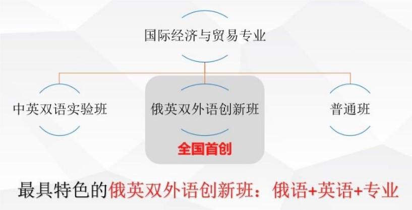 本专业于2003年开始设立俄英双外语创新班、中英双语实验班和普通班,实行分类培养。其中,俄英双外语创新班采取全国首创的‘俄语+英语+专业学习’的模式。现已优化升级建设为吉林省高等学校人才培养模式创新实验区(即俄英双语国际经贸复合型人才培养基地)。2018年国际经贸专业多样化人才培养模式获批吉林省教学成