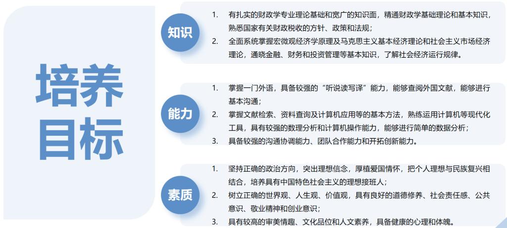 财政学专业培养践行社会主义核心价值观,具有社会责任感、公共意识和创新精神,掌握财政学基本理论与思维方式,熟悉国家财税政策法规,了解国家宏观经济状况,具备综合运用专业知识分析和解决公共经济问题能力的德、智、体、美、劳全面发展的符合新文科发展需要的应用型、复合型、创新创业型人才。本专业毕业生毕业后可以继续深造,或在财政、税务、公共投资、国有资产管理、社会保障等公共经济管理部门和各类企事业单位、非营利组织等从事相关工作,也可以进行自主创业。