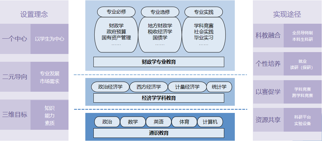 立足新文科建设,以服务区域经济社会发展为目标,以“德育为先、质量为本”为建设理念,打造财政学专业新特色、新优势,促进现代信息技术与教育教学深度融合;凸显实践育人特色,注重语言能力、信息技术运用能力、国际化视野的培养,培养德智体美劳全面发展的复合型高端财政专业人才。