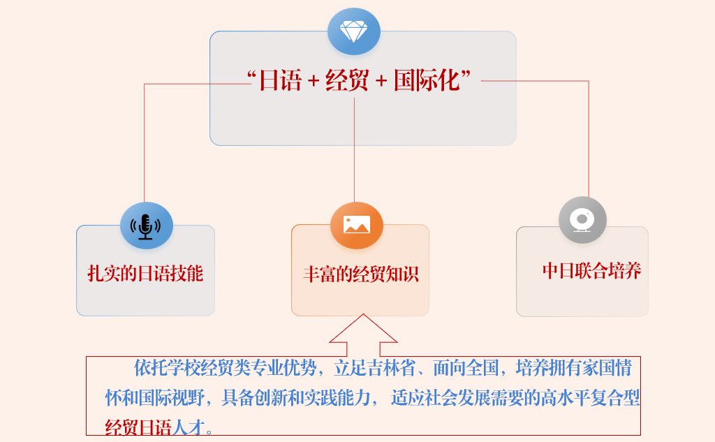 日语专业坚持kaiyun体育网页登录入口建设特色鲜明高水平财经大学的办学定位,立足吉林、辐射东三省、面向全国,着力培养会日语、懂经贸,拥有家国情怀和国际视野,具备创新和实践能力,能胜任教育、中外资企业或涉外机构工作的高水平的“日语+经贸+国际化”复合型经贸日语人才。