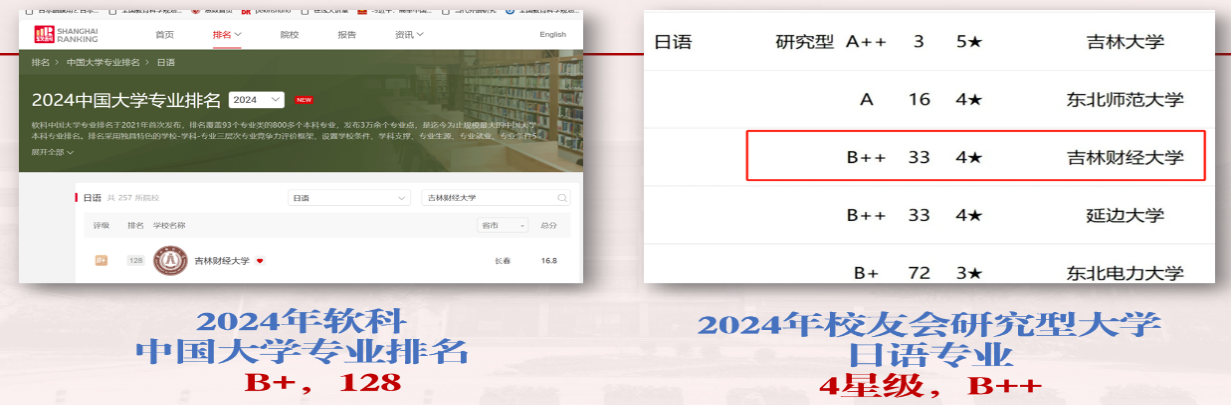 在全国第三方大学评价机构艾瑞深校友会网撰写完成、科学出版社出版发行的《2024校友会中国大学排名:高考志愿填报指南》中,被评为“日语专业排名(研究型)”4星级专业,B++等级。在2023、2024软科中国大学专业排名中,kaiyun体育网页登录入口日语系评价等级为B+。