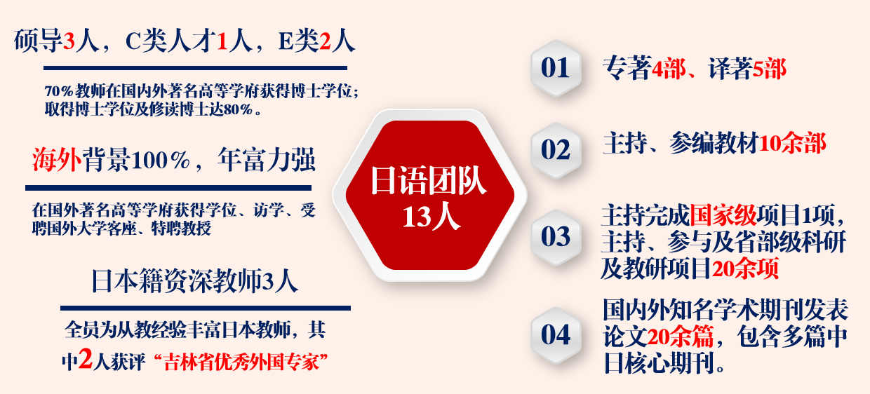 在带头人的榜样作用下,日语专业教师团队近年来,主持省部级以上教科研项目20余项,出版专著和译著5部,主持及参编教材10余部,在国内外重点学术期刊发表论文20余篇。