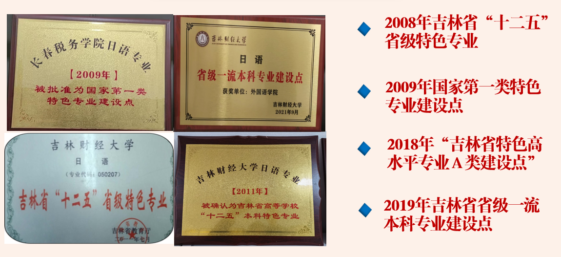 2009年成为国家第一类特色专业建设点,是省属高校中首批获此殊荣的日语专业,2011年获评吉林省本科院校“十二五”优势特色专业。2010年和2014年连续两年获得吉林省政府教学成果二等奖。2018年获得吉林省高水平特色专业A类,2018年在吉林省高校专业综合评估中荣获A类专业。2019年获批双万计划第一批一流本科专业建设点。科研方面,我系学科带头人王艳华教授在2016年荣获国家社科基金项目立项,并于2020年顺利完成结项。国社科的立项和结项实现了kaiyun官网外语类国社科零的突破。