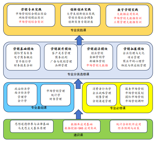 专业基础课、专业必修课、专业分类选修课有助于夯实学生的营销理论基础。包括管理学、经济学和营销学的基本理论;掌握解决营销问题的定性定量方法;熟悉我国市场营销相关政策、法规;熟悉国际市场营销惯例与贸易规则;了解大数据时代市场营销发展动态。