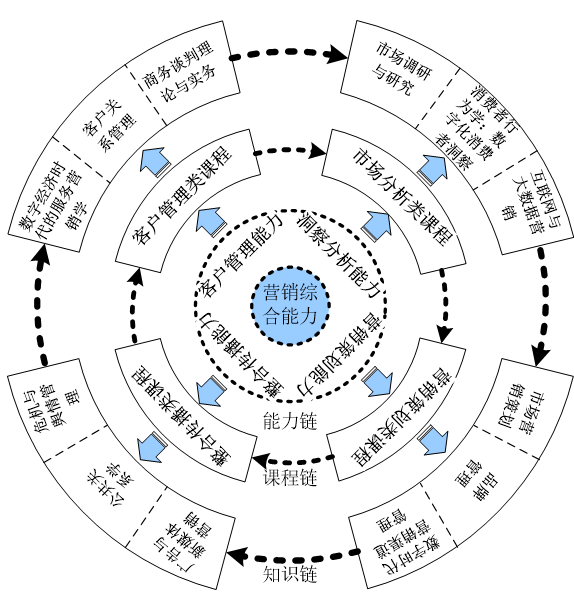 以学生“洞察、策划、沟通、管理”能力链为核心,构建“市场洞察-营销策划-整合传播-客户管理”四大专业课程群,实现了“能力链、课程链、知识链”三链协同的专业理论课程体系。