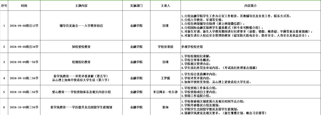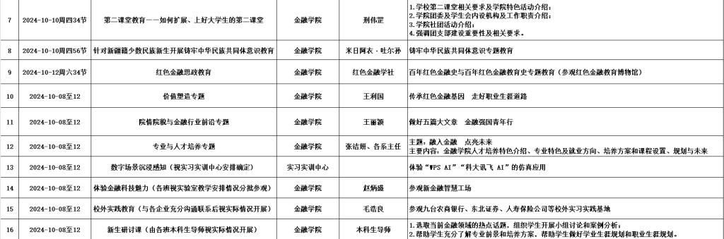 延续金融学院本科生导师制传统,为2024级新生每班分配一名由专业教师担任的导师,新生在导师的指导下,通过主题班会、学术沙龙、专业案例研讨、课堂个人反思等灵活多样形式,选取当前金融领域的热点话题,组织学生开展小组讨论和案例分析,培养学生的分析能力和批判性思维。并由各系主任牵头带领各系教师帮助学生充分了解专业前景和培养方案,帮助学生做好学业生涯规划和职业生涯规划。鼓励学生进行个人反思,总结专业学习过程中的收获和不足,明确下一步学习重点,增进对金融学科专业的理解与兴趣。(5学时)