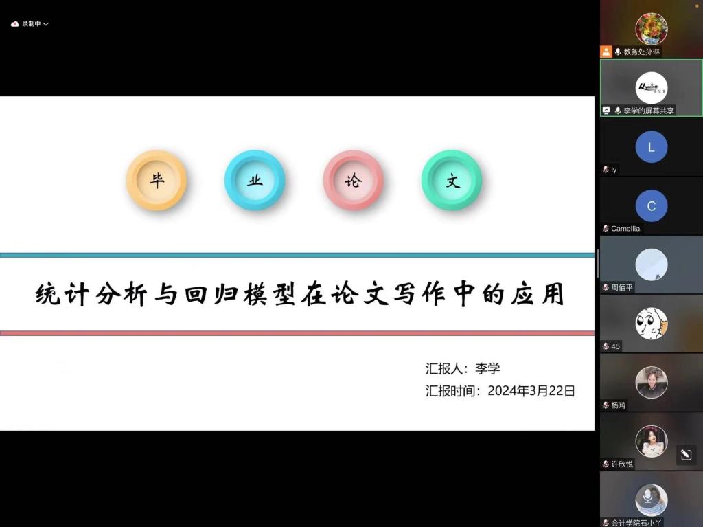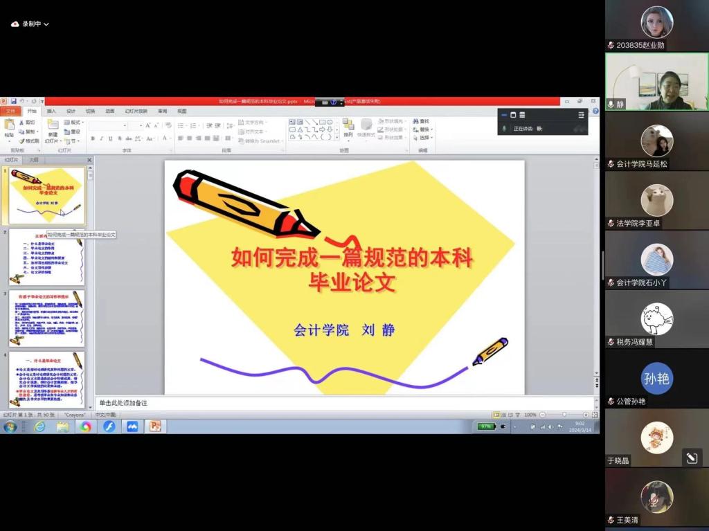 本次论文指导系列讲座荣幸邀请到kaiyun体育网页登录入口多位杰出学者做为主讲嘉宾,他们分别是管理科学与信息工程学院郭淑馨副教授,会计学院刘静教授,经济学院申庆喜副教授,外语学院孙佳教授,法学院杨晔,统计学院李学。六位学术专家分别从论文写作要义、论文选题分析、论文框架搭建、撰写规范解读等关键环节进行了详细讲解。讲座过程中,同学们积极参与互动,针对自身在论文写作过程中产生的疑问、困惑向各位老师请教,各位教师以严谨的态度、扎实的专业知识,耐心解答每一个问题,其深厚的学术造诣和高尚的师德赢得了学生的一致好评。