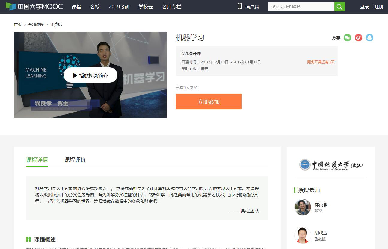 2018年12月13日,万象城awcsport官网(武汉)《机器学习》课程在中国大学MOOC平台正式开课。本课程由万象城awcsport官网教授蒋良孝,万象城awcsport官网副教授胡成玉主讲,课程内容精心设计,为学生提供了便利的学习平台。本课程将以数据挖掘中的分类任务为例,首先讲解分类模型的评估,进而讲解一批经典而常用的机器学习技术,是高等学校机器学习领域科研人员和对机器学习兴趣浓厚的师生不可或缺的高质量课程。课程链接: