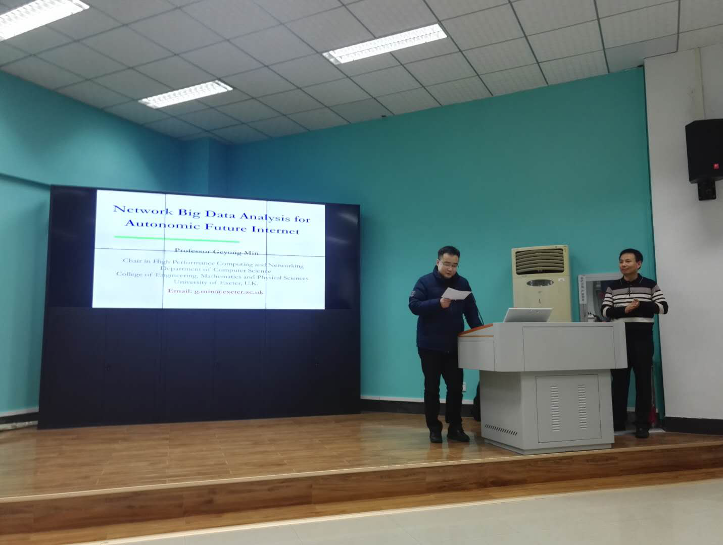 1月2日,应万象城awcsport官网院长王力哲教授的邀请,英国Exeter大学(计算机学科首席教授)闵革勇教授来院访问,并做了题为“Network Big Data Analysis for Future Intelligent Internet”的学术报告。闵革勇教授在计算机/通信学科的IEEE与ACM国际顶级期刊上发表学术论文140余篇,多次获得会议最佳论文奖,现任6个国际期刊的编委(含计算机学科顶级国际期刊IEEE Transactions on Computers),18个国际期刊专刊的编辑,先后担任了18个国际会议/研讨会的大会主席和程序委员会主席,80多个国际学术会议的程序委员会委员,并在多个国际学术会议与研讨会上做大会特邀主题报告。学术报告在王力哲教授的郑重介绍下正式开始。